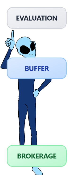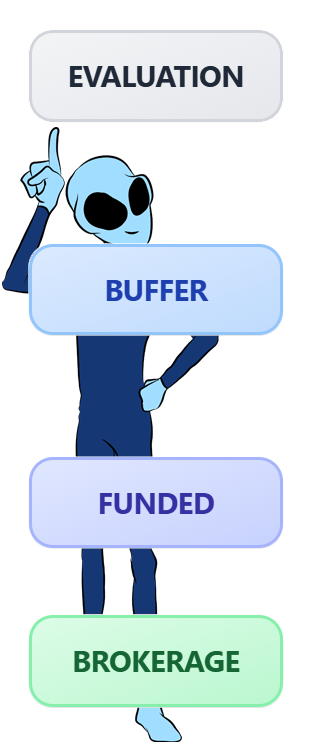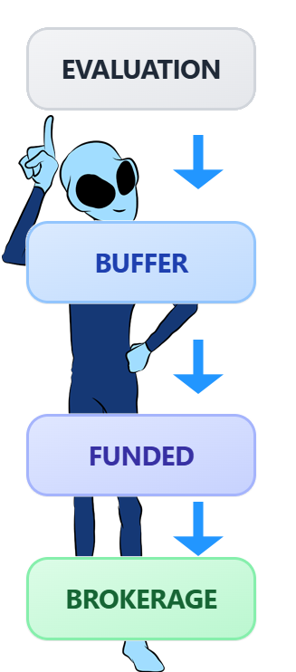 Evaluation → Buffer → Sim Funded → Live Brokerage. Clear stages so you always know what’s next.